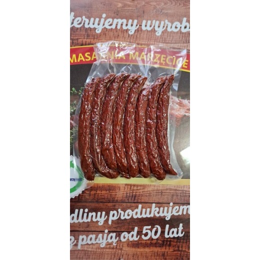 Masarnia Marzęcice, che opera all’interno della struttura della Cooperativa Comunale, offre salumi tradizionali polacchi preparati secondo ricette collaudate, senza conservanti, coloranti né additivi chimici. La produzione si basa su materie prime locali, sul taglio manuale della carne e sull’affumicatura naturale a freddo con fumo di ontano.